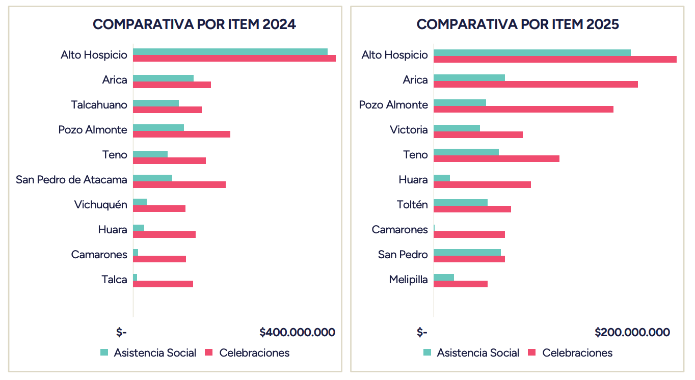 El reporte detalló situaciones de disparidad presupuestaria alarmantes. En el caso de Talca, la capital regional figura en el listado de municipios que, durante 2024, registraron una diferencia superior a los $90 millones entre lo invertido en festividades y lo destinado a ayuda social para los vecinos.