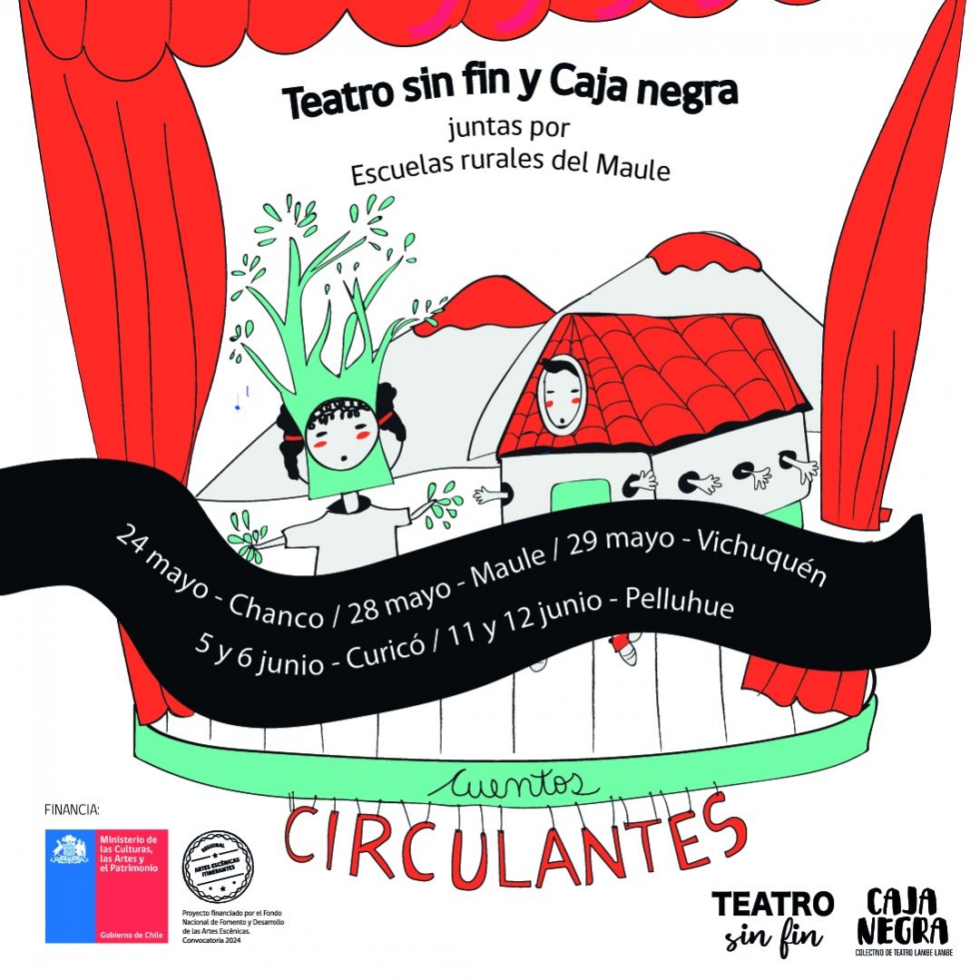 “Cuentos Circulantes” Teatro sin fin y Caja negra juntas por 7 escuelas rurales del Maule es una iniciativa que busca aportar desde las artes al desarrollo educativo. En donde se unen Teatro sin fin en la Narración oral y Caja Negra con su teatro lambe lambe de títeres, para impulsar el acceso a las artes escénicas y la lectura a los más pequeños con una propuesta de pequeño formato.