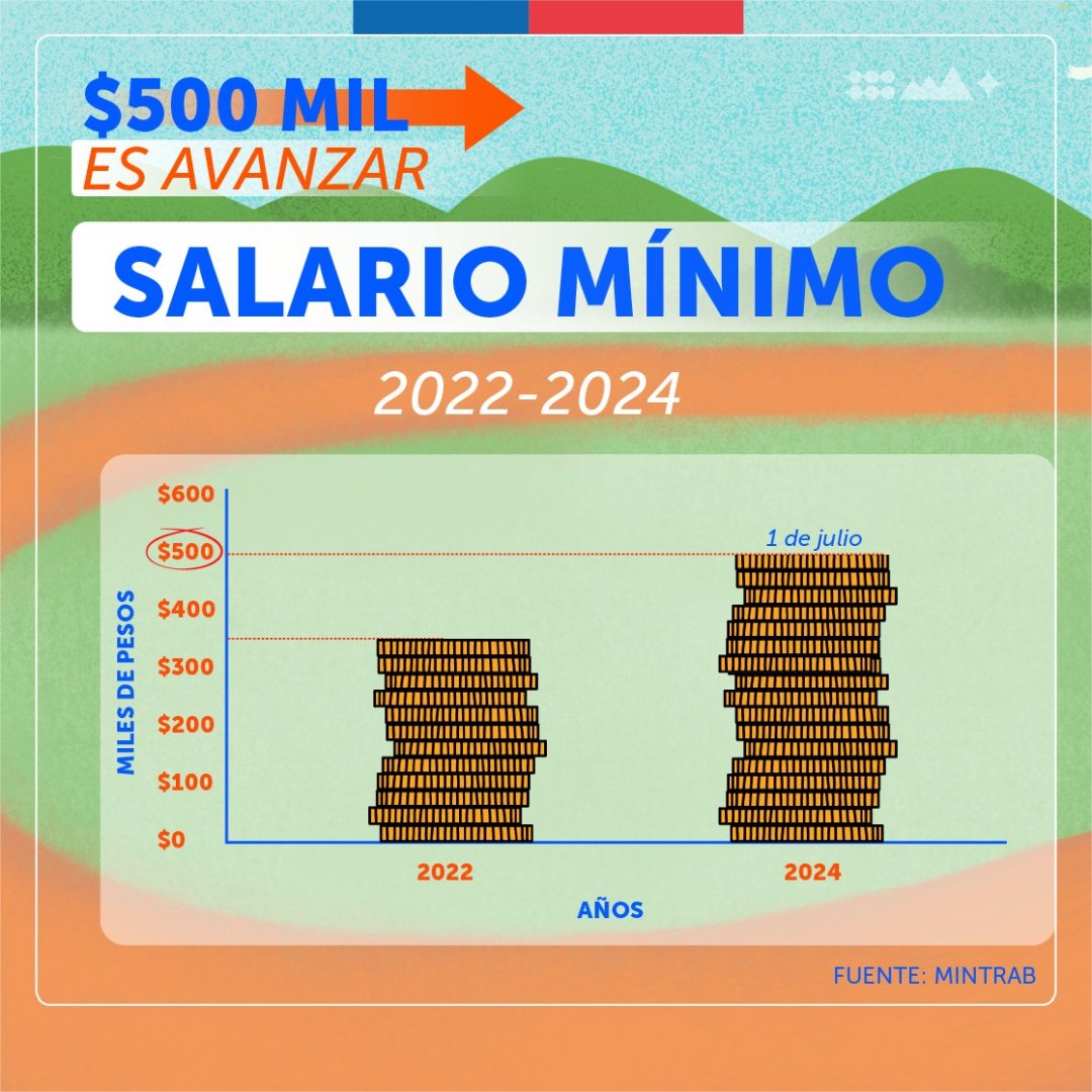 Asimismo, el pasar desde los $350 mil vigentes al asumir el Gobierno del Presidente Gabriel Boric a $500 mil, implica un aumento histórico de 43% en términos nominales (considerando la variación de la inflación), mientras que el alza real (descontando la inflación) llega a cerca de un 20%. Esto último conlleva un avance en el poder adquisitivo.