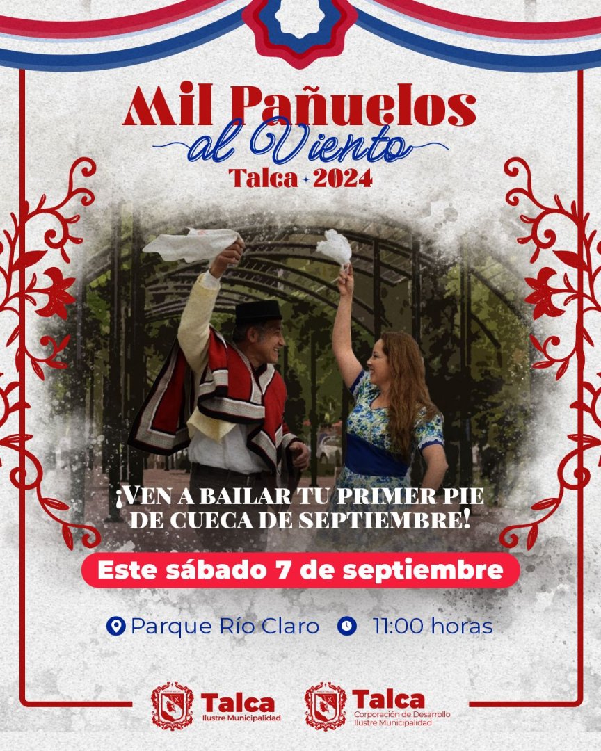Como parte de las celebraciones de Fiestas Patrias anunciadas por el alcalde Juan Carlos Díaz, la Municipalidad de Talca -a través de la Corporación Municipal de Desarrollo- realizará la primera versión del Campeonato Comunal de Cueca Escolar 2024 “Mil Pañuelos al Viento”, que se efectuará el sábado 07 y domingo 08 de septiembre en el Parque Río Claro de nuestra comuna.