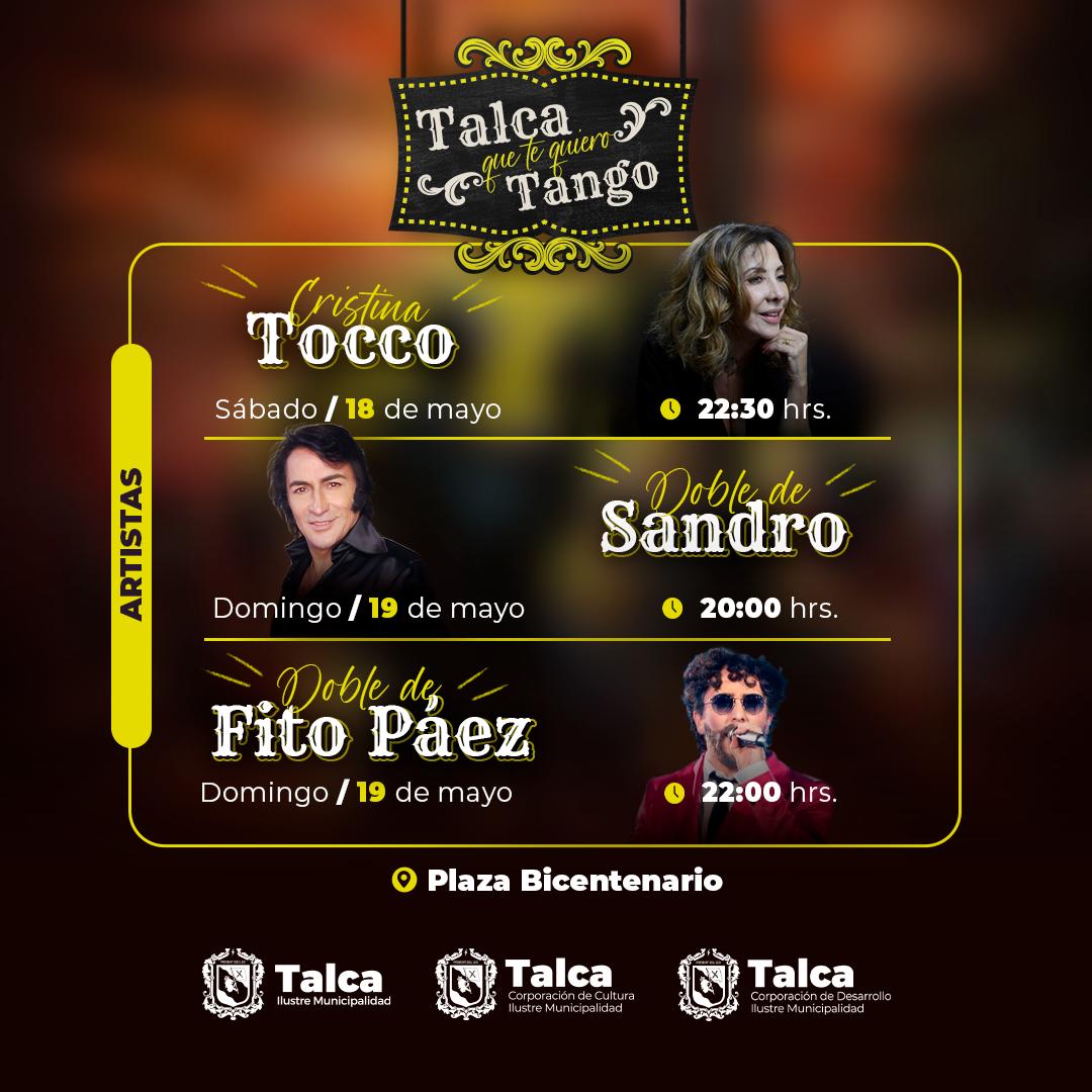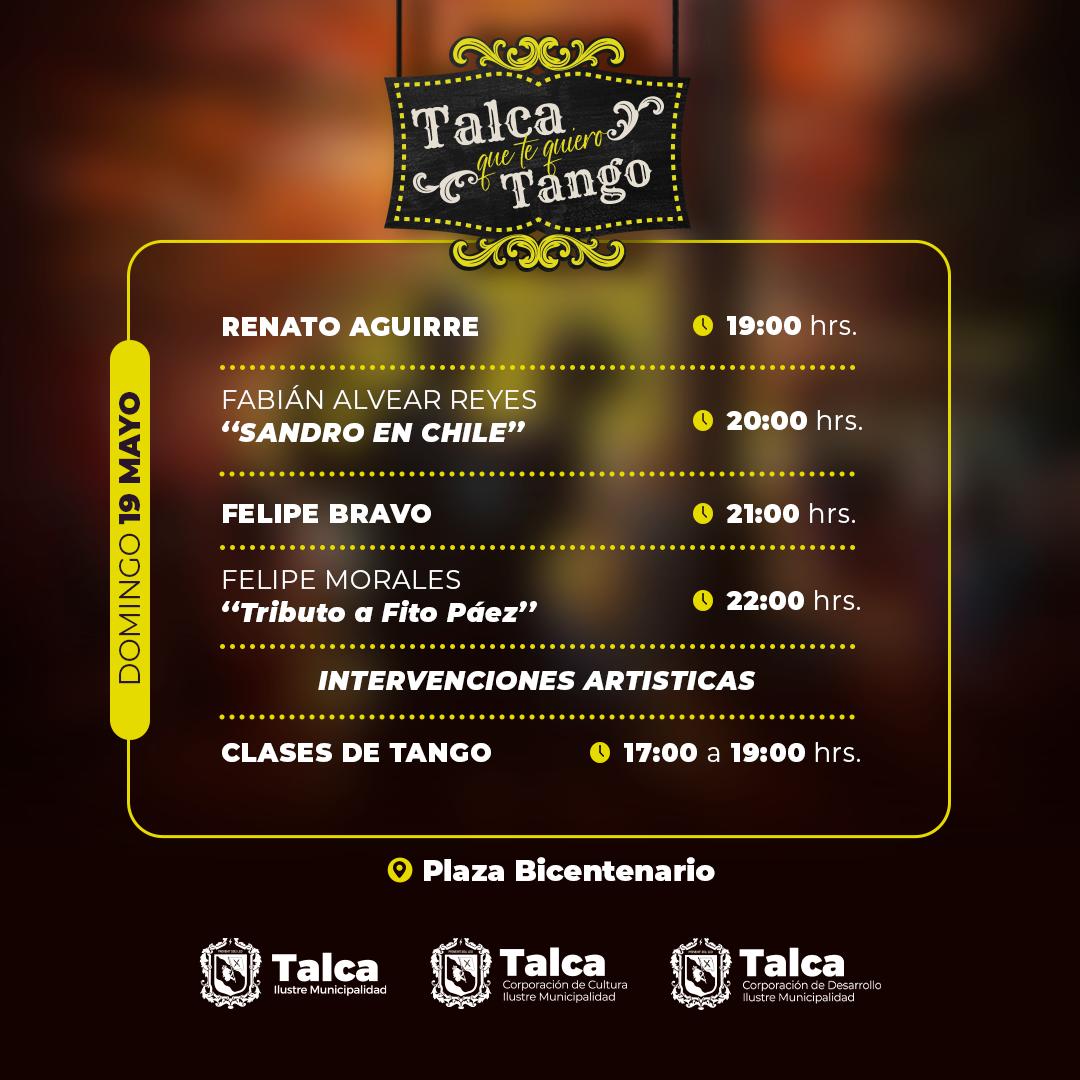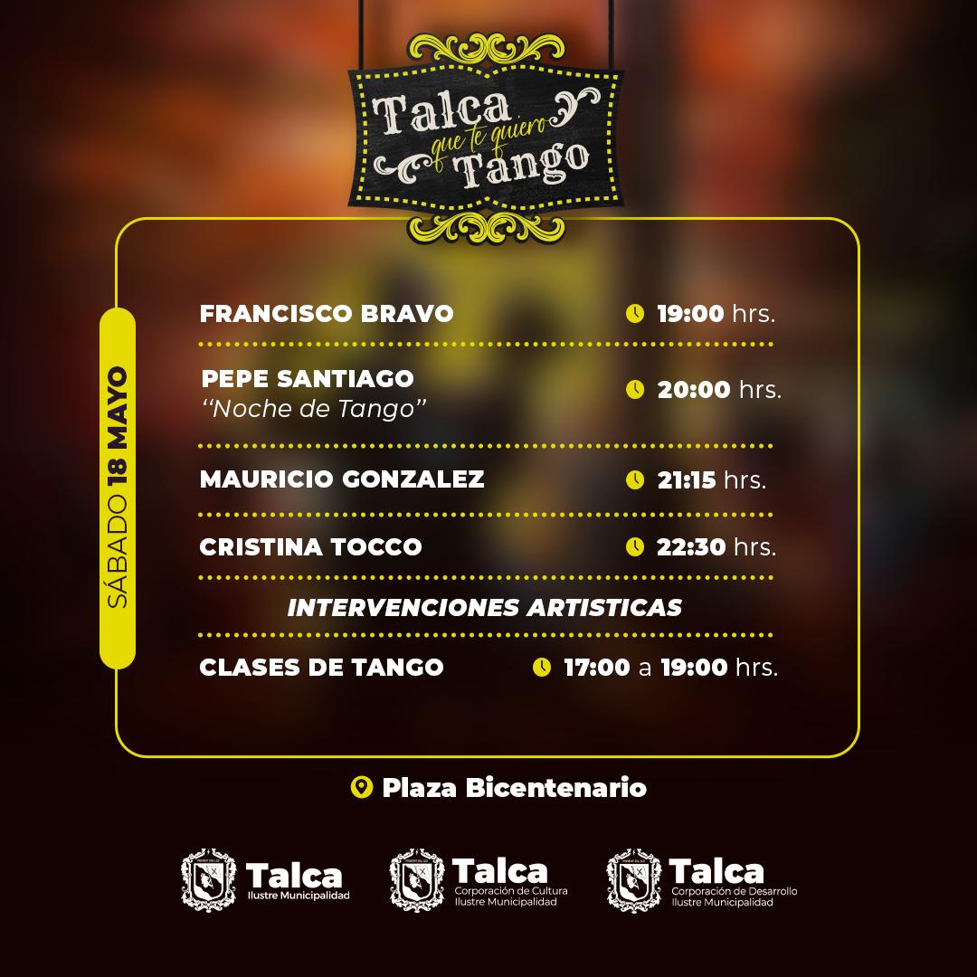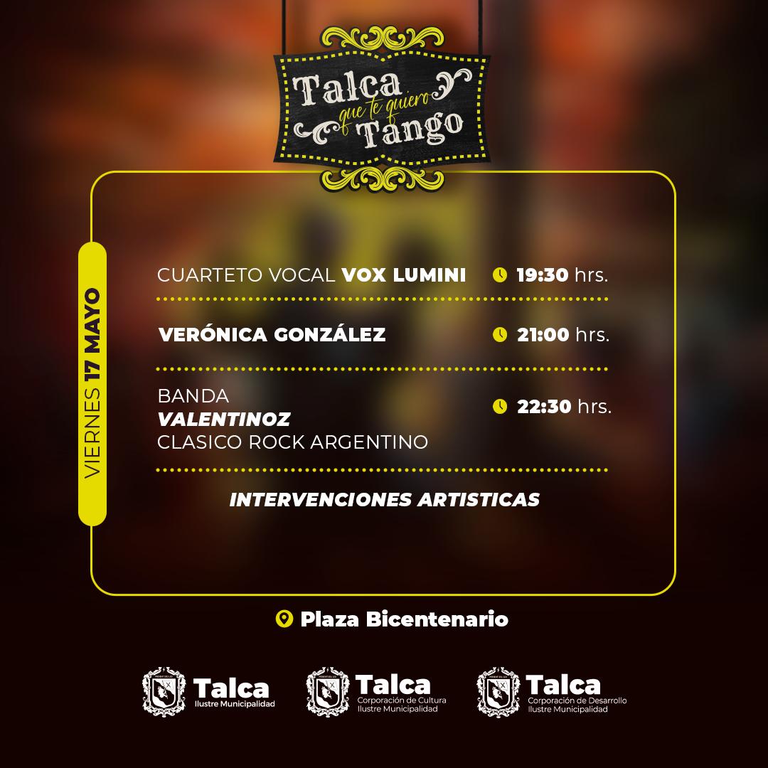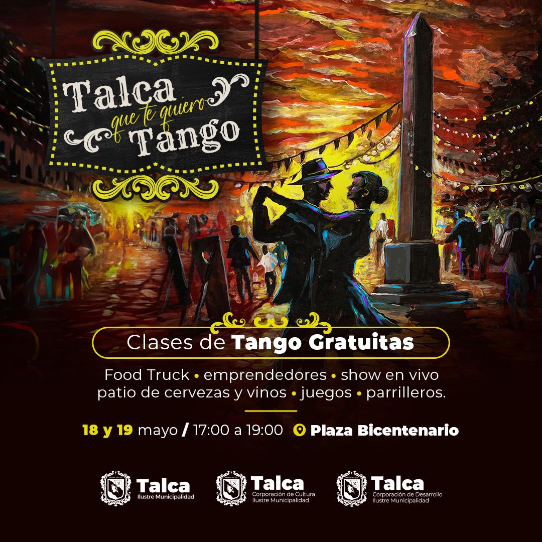 Los amantes del arte, la cultura y especialmente del tango podrán disfrutar este viernes 17, sábado 18 y domingo 19 de mayo, de la tercera versión de la fiesta “Talca que te quiero Tango”, organizada por la Municipalidad de Talca.
