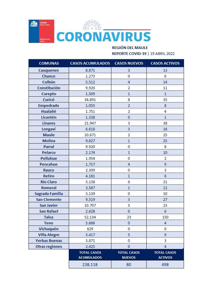 En un nuevo informe sobre la situación del Covid-19 en el Maule, desde la Seremi de Salud expusieron que en las últimas horas se registraron 80 nuevos casos, de los cuales, 75 presentaron síntomas y 4 fueron asintomáticas. Lo anterior, deja un total de 238.118 personas diagnosticadas con la enfermedad en la región desde que comenzó la pandemia. Con respecto a los fallecidos, se contabilizó un nuevo deceso, lo que deja un total de 2.884 muertos.